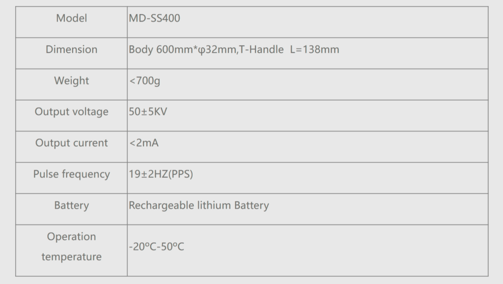 The power switch is located on the back of the device and is equipped with a light indicator, while the electric shock button is positioned on the handle for easy operation.